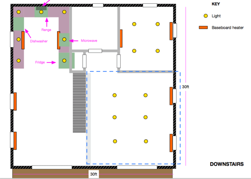 We have baseboards running in symmetry in the space. See this nifty guide Phil whipped up to summarize the electrical design specs (the dotted blue highlight notes the living room area):