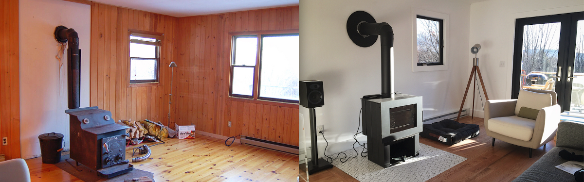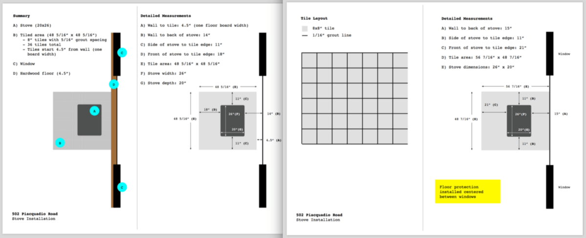 You don’t mess around here. Between your county and manufacturer requirements, all detail matters. You want the setup to avoid being near combustibles and there are multiple ways to go about this depending on your design preferences and the space you have to work with. For example, we didn’t need a heat-shield on the wall behind the stove because we placed the stove far away/enough so that it wasn’t a risk but we did ensure to have a large surface are of tile or stone for the hearth (floor area beneath and around the stove to avoid combustion with wooden flooring nearby). Iterations of nifty guides; left to right:
